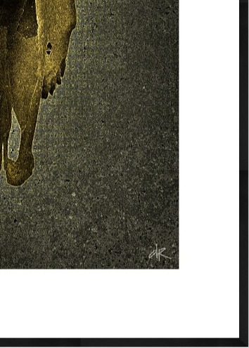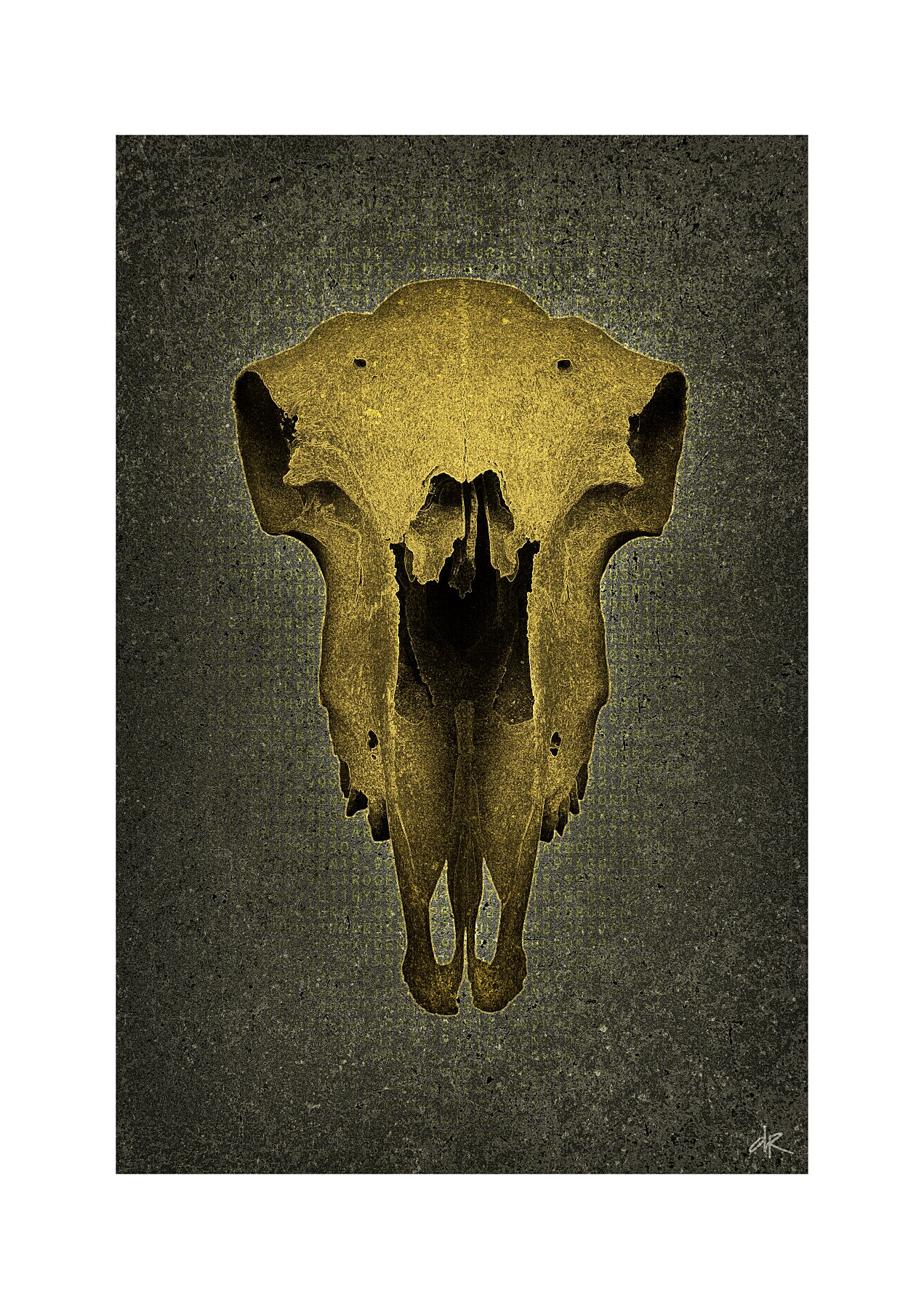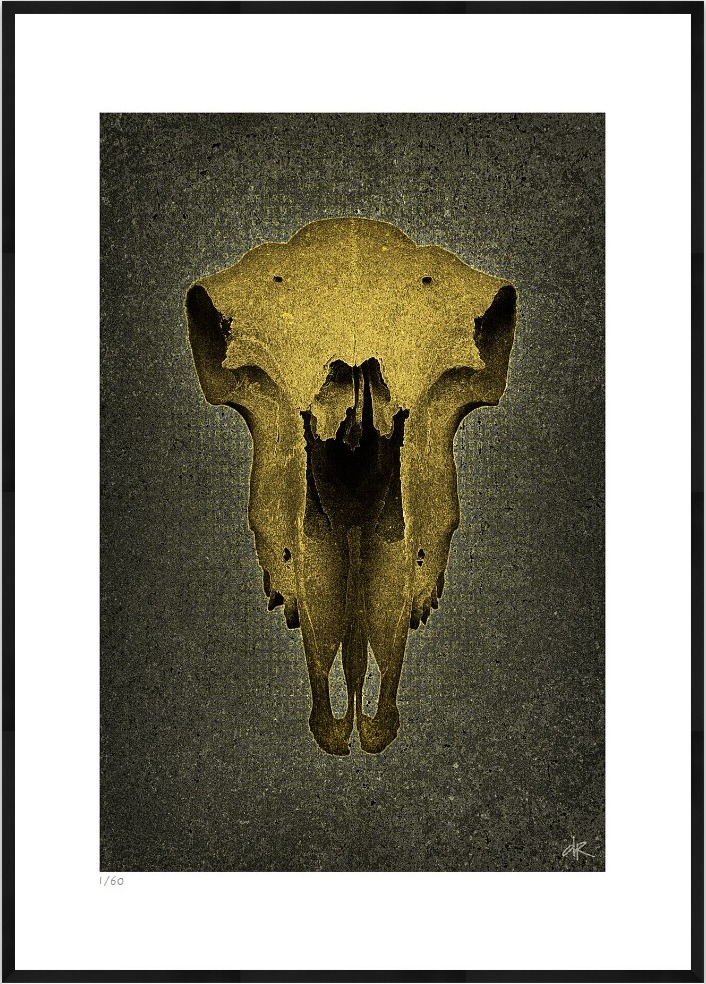 One of his most striking bodies of work reinterprets Brutalist architecture. The rigid grids and repetitive windows of concrete skyscrapers are transformed into hypnotic, almost meditative compositions. What was once cold and imposing becomes rhythmic, abstract, and strangely beautiful, revealing an unexpected emotional depth within industrial form. His exploration of organic subject matter is equally compelling. In “Skull with Horns,” a weathered, tactile form is set against an unnatural cyan field, evoking a sense of mythic permanence. The piece feels archaeological and futuristic at once, a relic suspended outside of time.
